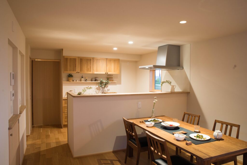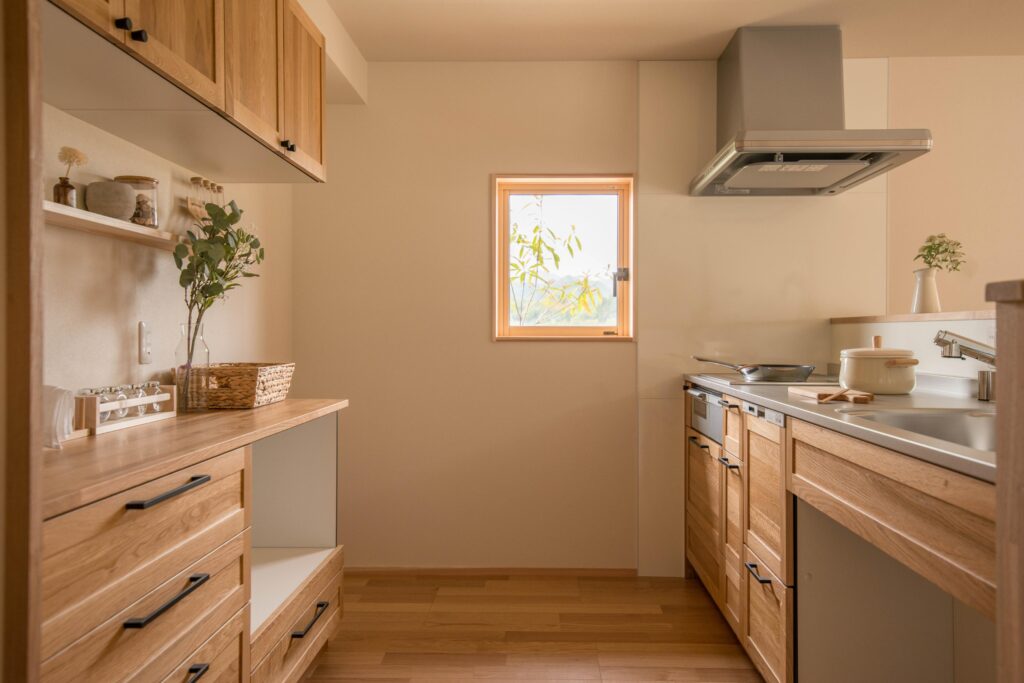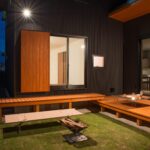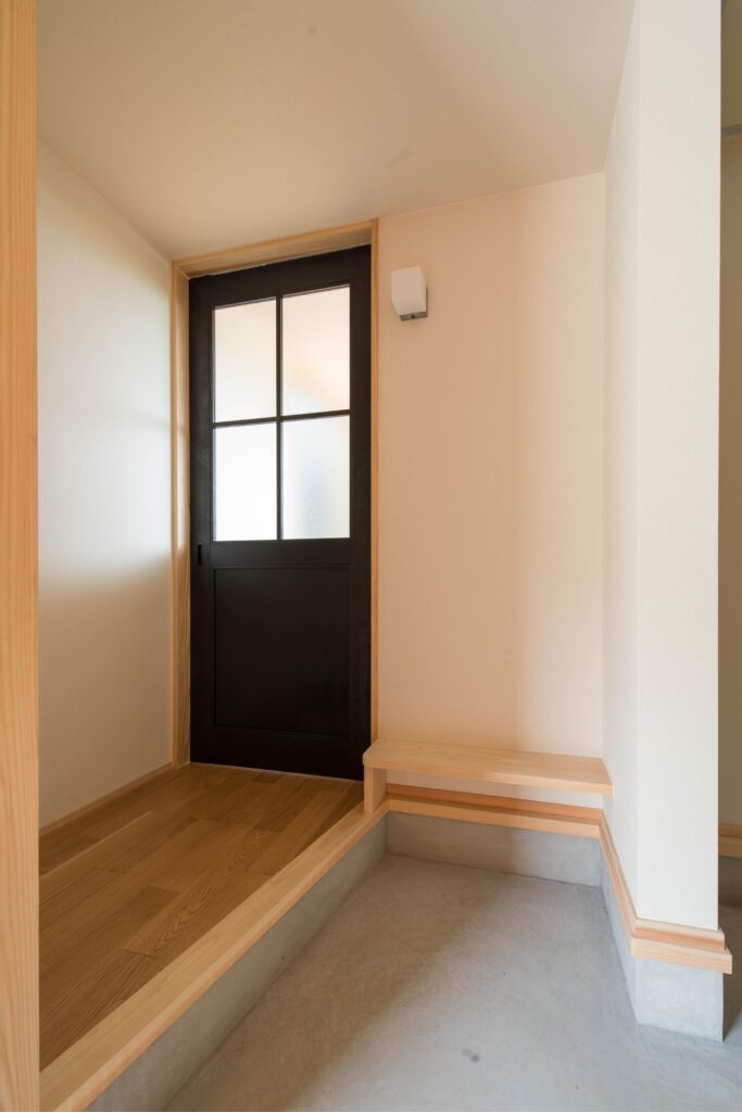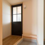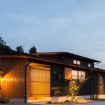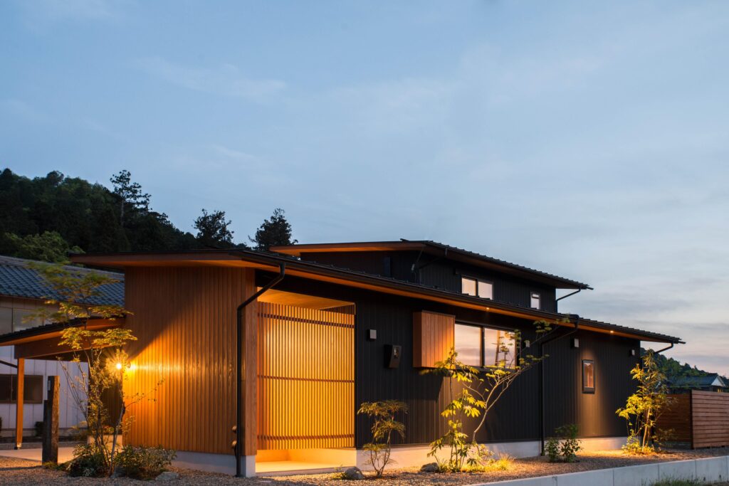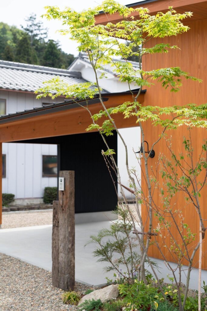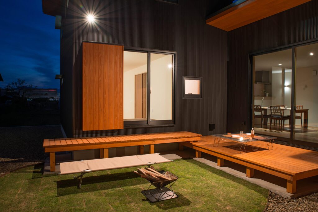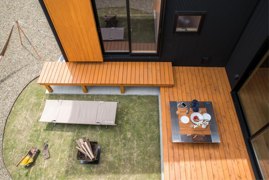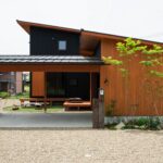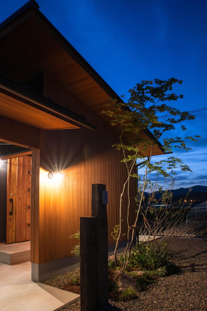 ガルバリウム鋼板のハードな外観に植栽や杉板をうまく使い、目隠しや柔らかい印象を加えました。理想的な内と外のつながりを持たせ、一年を通していつでも、また、部屋でも庭でもどこにいても寛げるように設計しました。