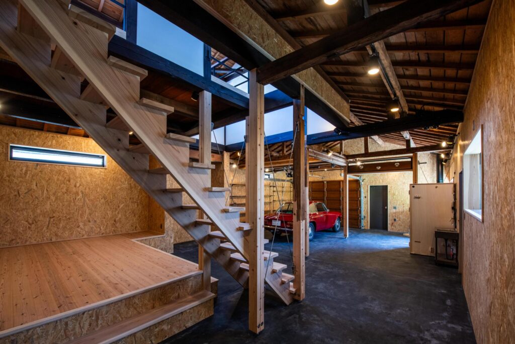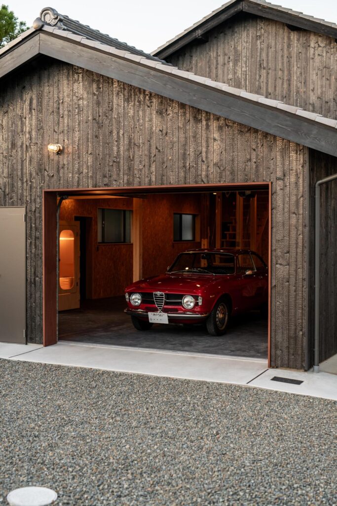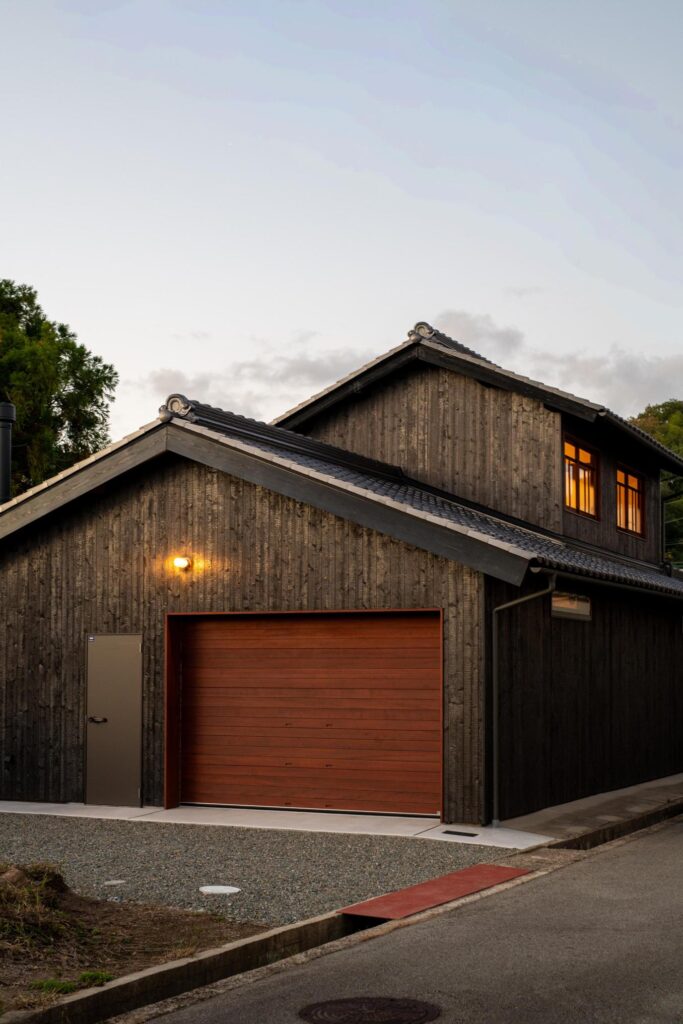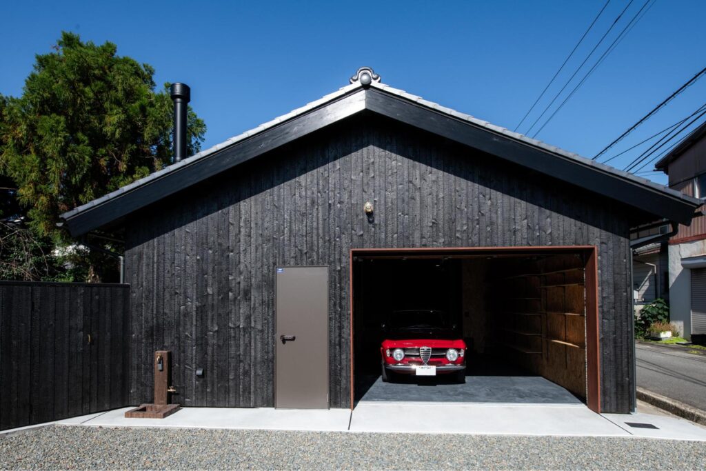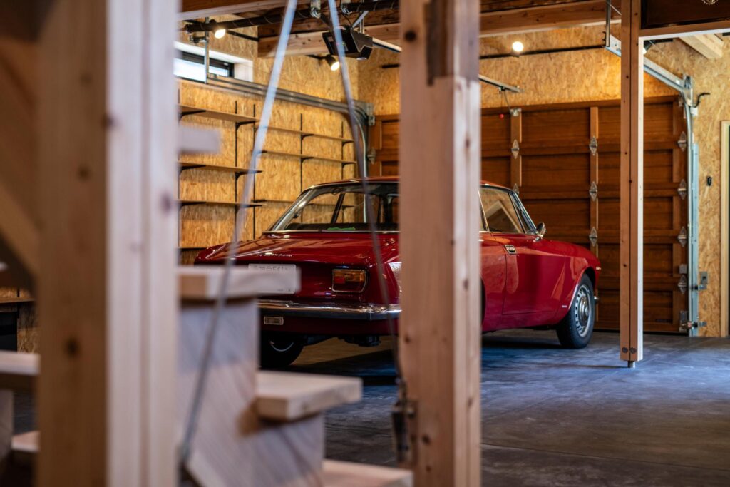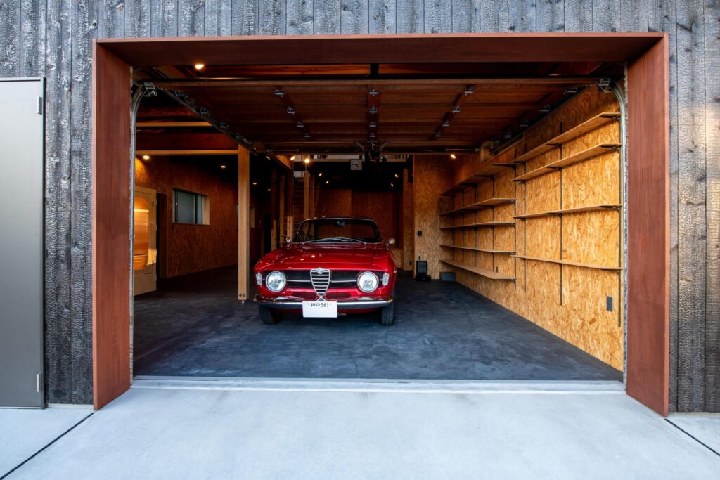 木製のオーバースライドやシャッターが付いた大人かっこいいガレージ