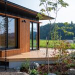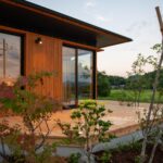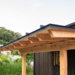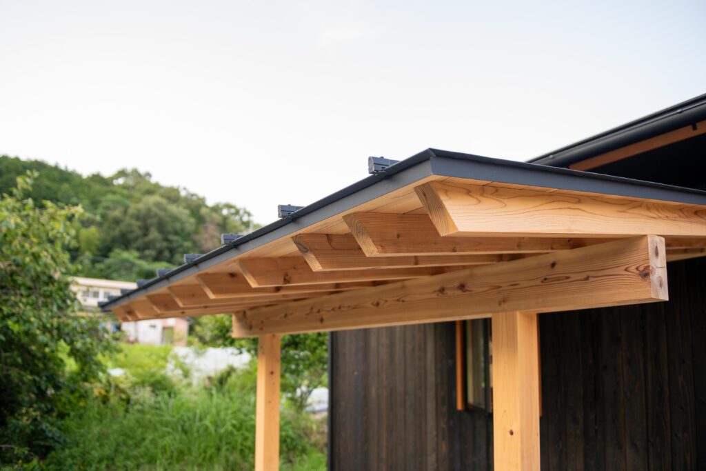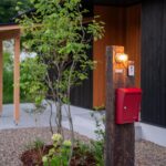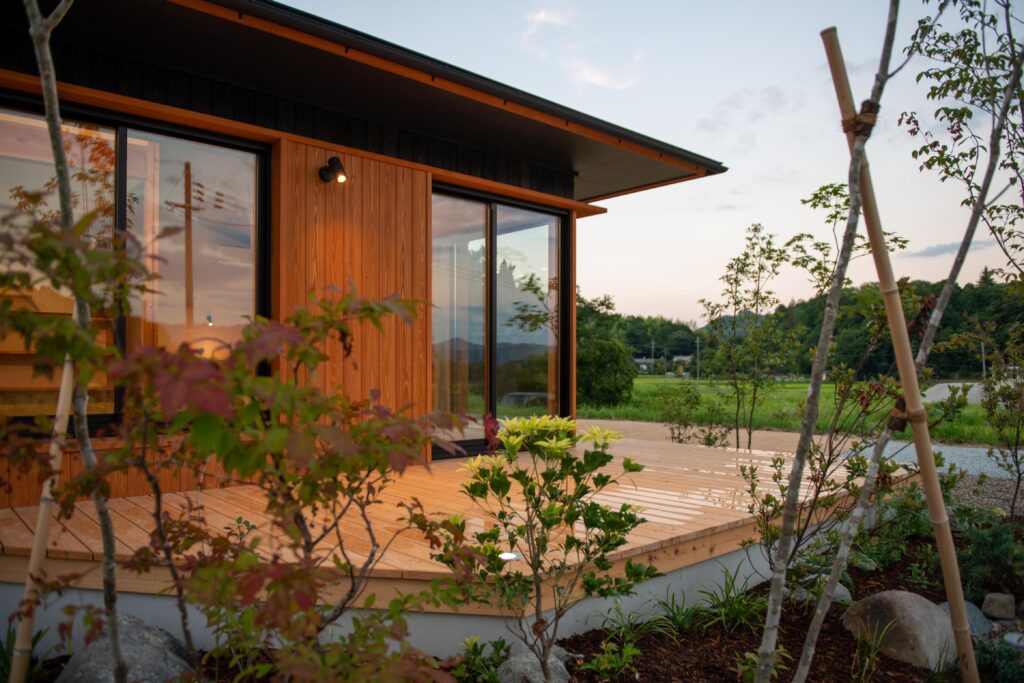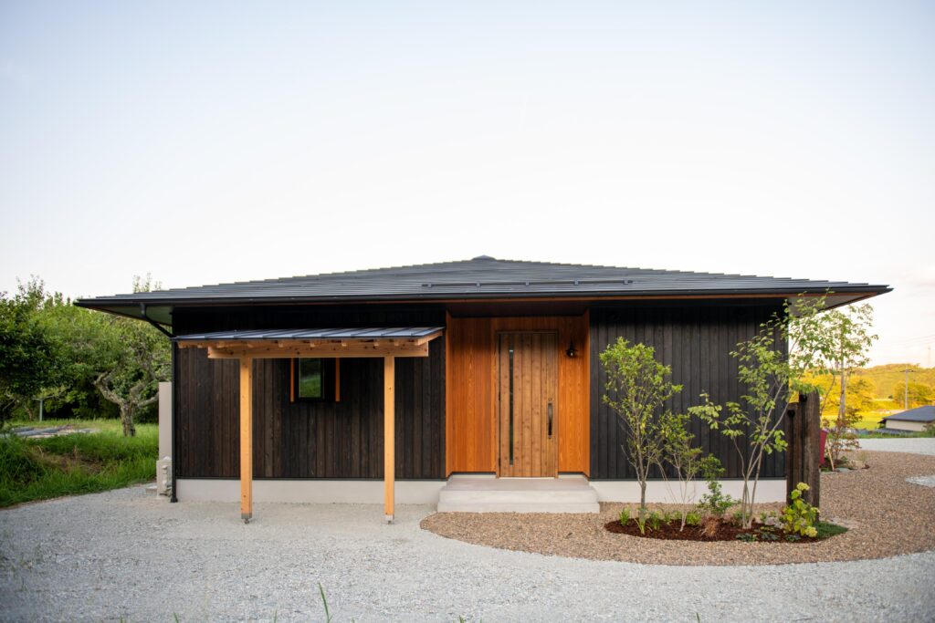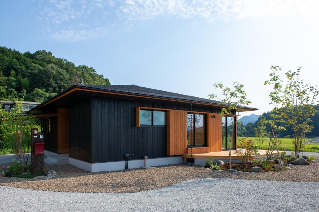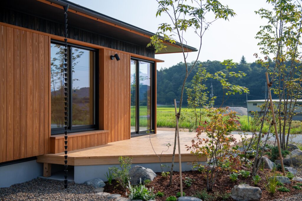 方形屋根の平屋のお家。広いウッドデッキ、ウチとソトをつなぐ植栽でまとまりのある美しい外観に仕上がりました。