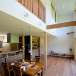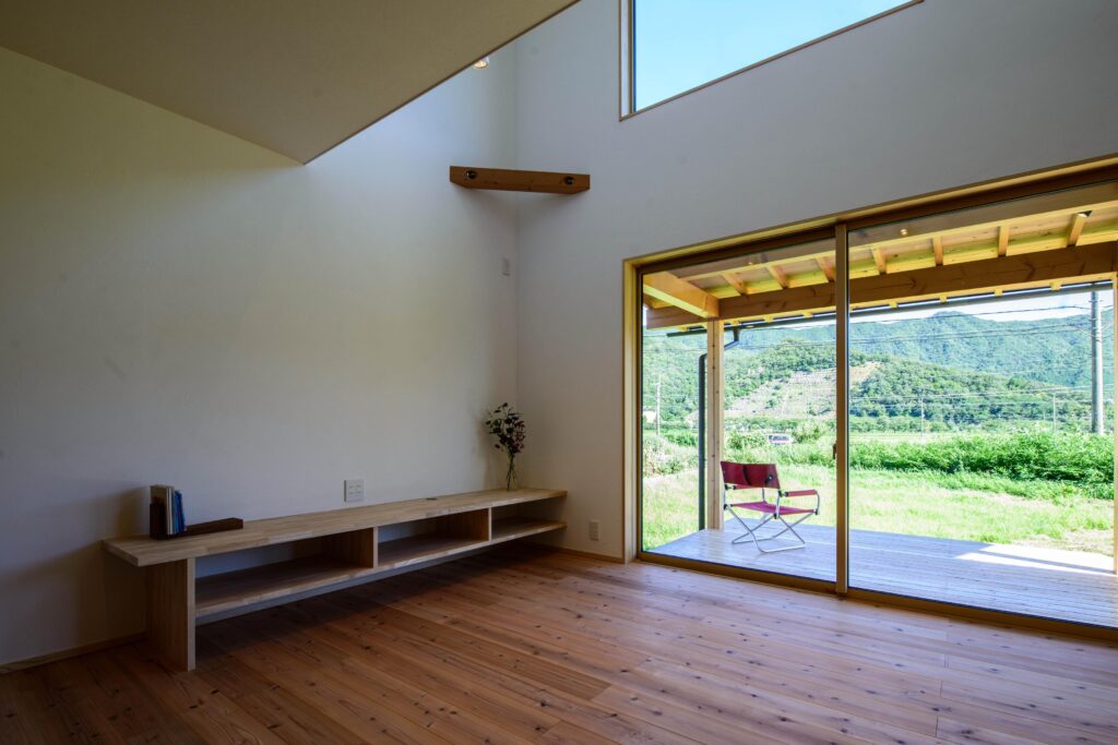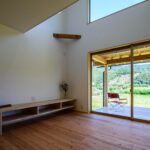 桜並木を望む大きな吹き抜け窓の家